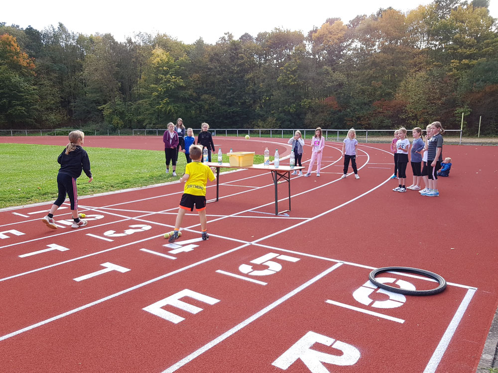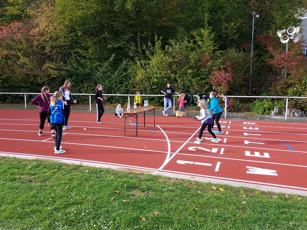 Mit 20 Jugendlichen aus der Jugendturn-Gruppe von Andrea Müller und aus der Jugend-Leichtathletik-Gruppe von Anna-Lena Wellner startete das vereinsinterne Lauffest mit einer Biathlon-Staffel. Hier mussten 4er-Teams eine Laufstrecke absolvieren und am Ende Flaschen von einem Tisch werfen. Für jede Flasche, die stehenblieb, musste man eine kleine Strafrunde laufen.