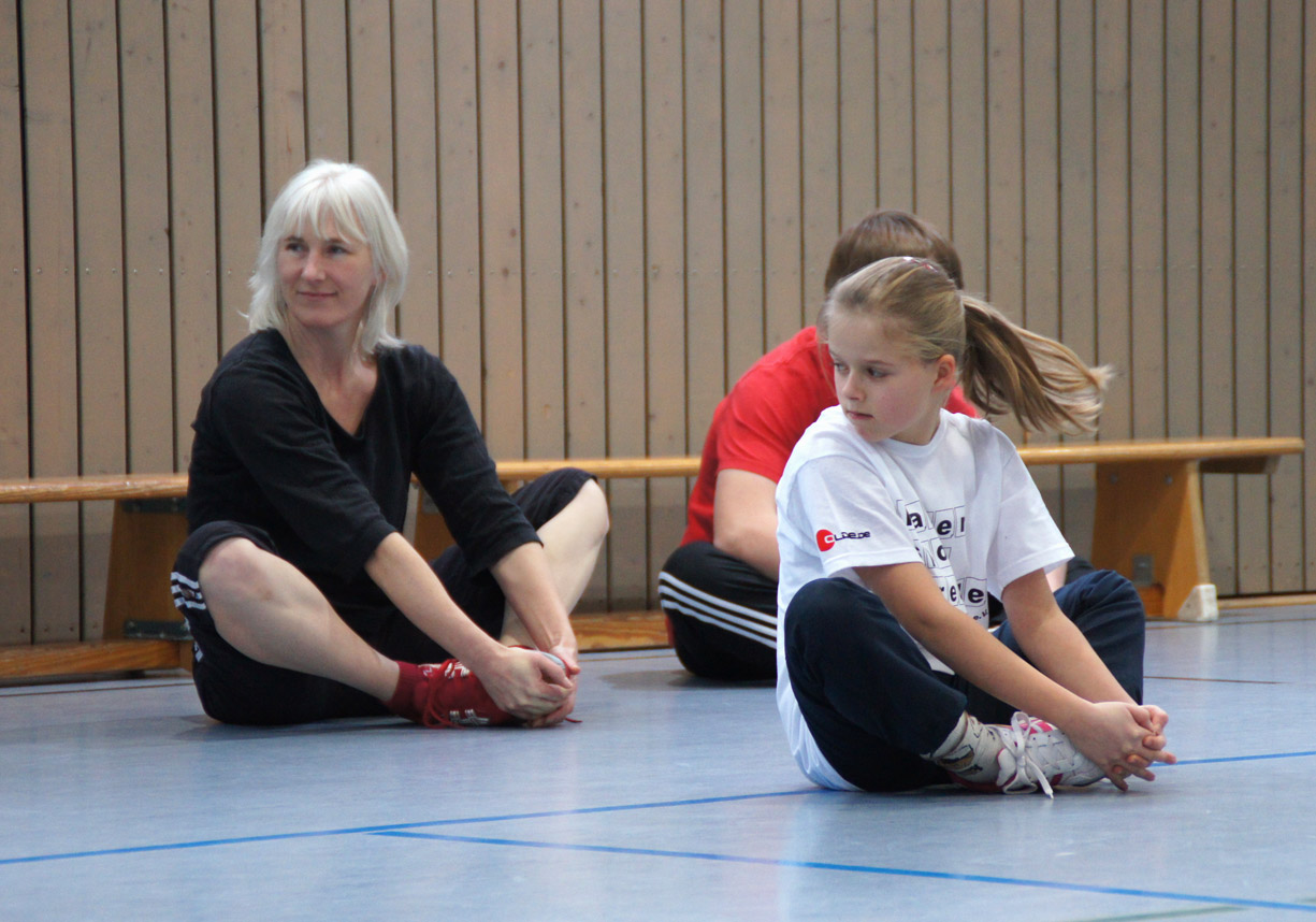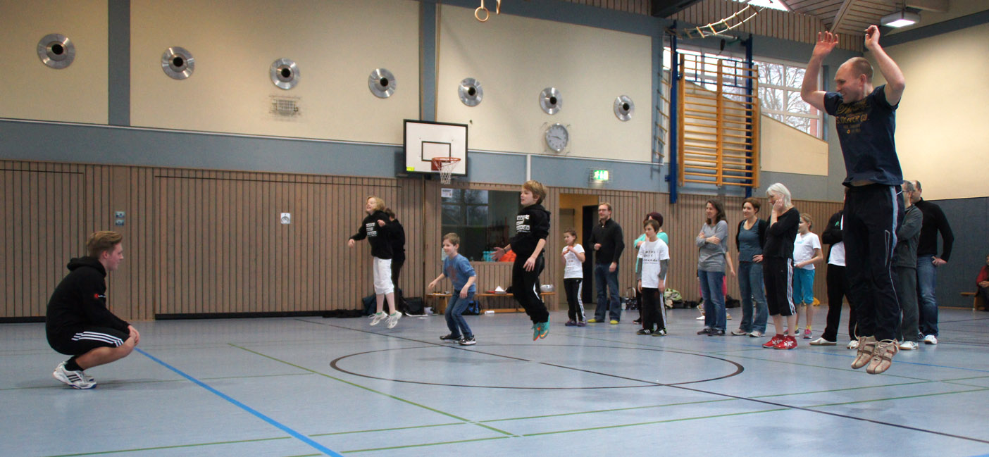 Nach einem kurzen Kennlernspiel und einem Aufwärmtraining nach 'Footballer' Art durften sich die Gäste kurz ausruhen, um den Darbietungen am Minitrampolin und Barren zuzusehen, bevor sie dann im Gefängnisausbruch gegen die 'Elite' antreten mussten. Dabei muss den Gästen sogar der Gewinn (wenn auch im Hundertstelbereich) zugesprochen werden.