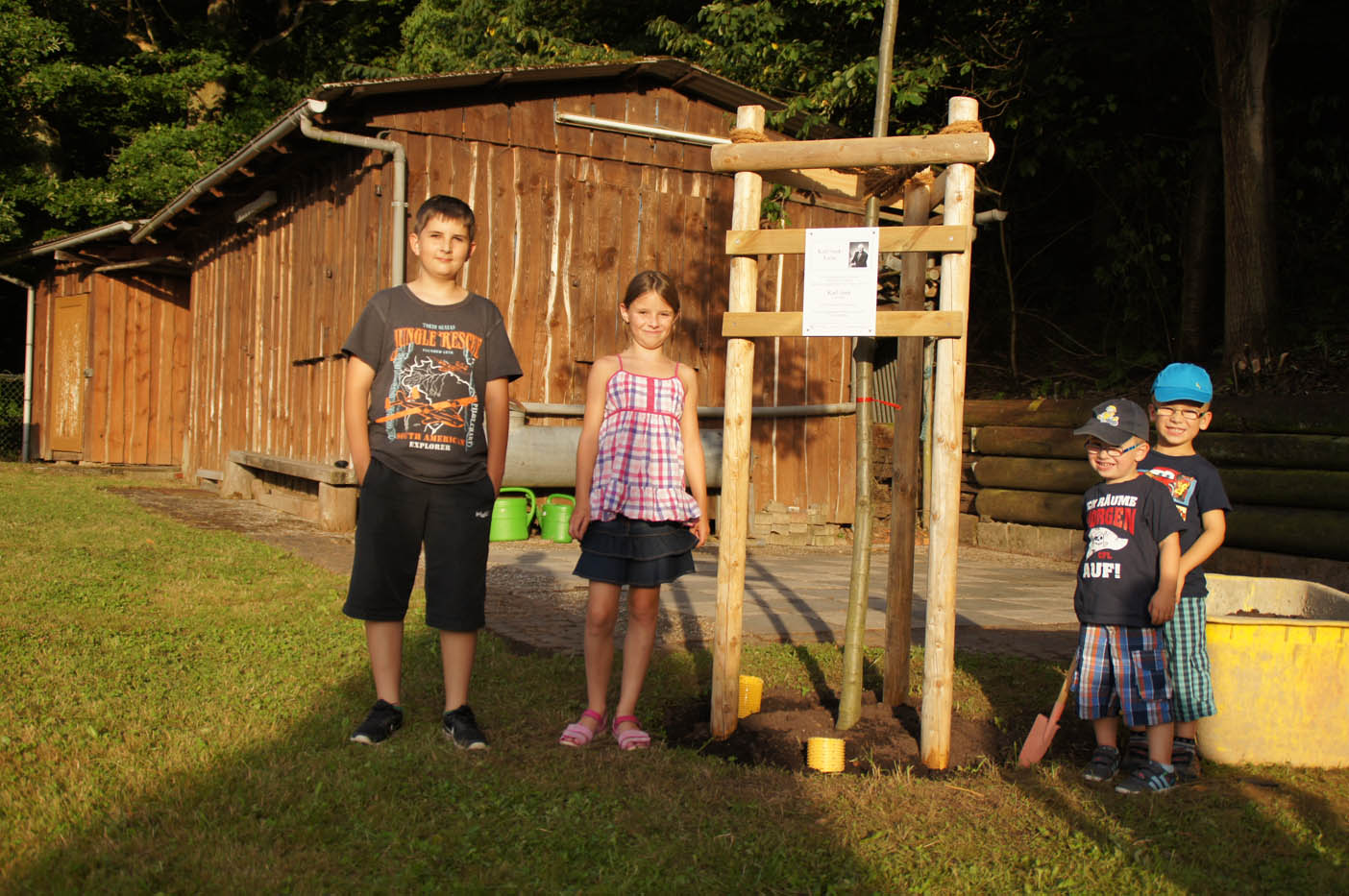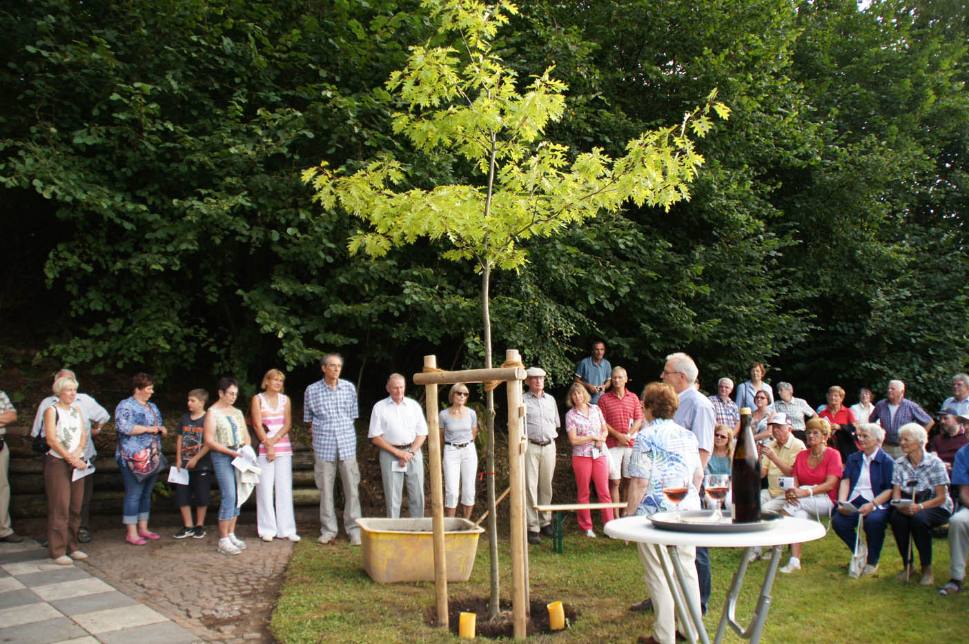 Anschließend ließen es sich die anwesenden Weggefährten von Karl nicht nehmen, einen Beitrag zum Setzen des Denkmals ihres Angehörigen oder Freundes Karl Junk zu leisten und versorgten die Eiche ebenfalls mit Erde oder Wasser, der eine oder andere auch mit einem Abschiedsgruß. Enkel Lukas Junk bekam einen kleinen Ableger der Karl-Junk-Eiche. Eine bewegende und feierliche Gedenkstunde.
