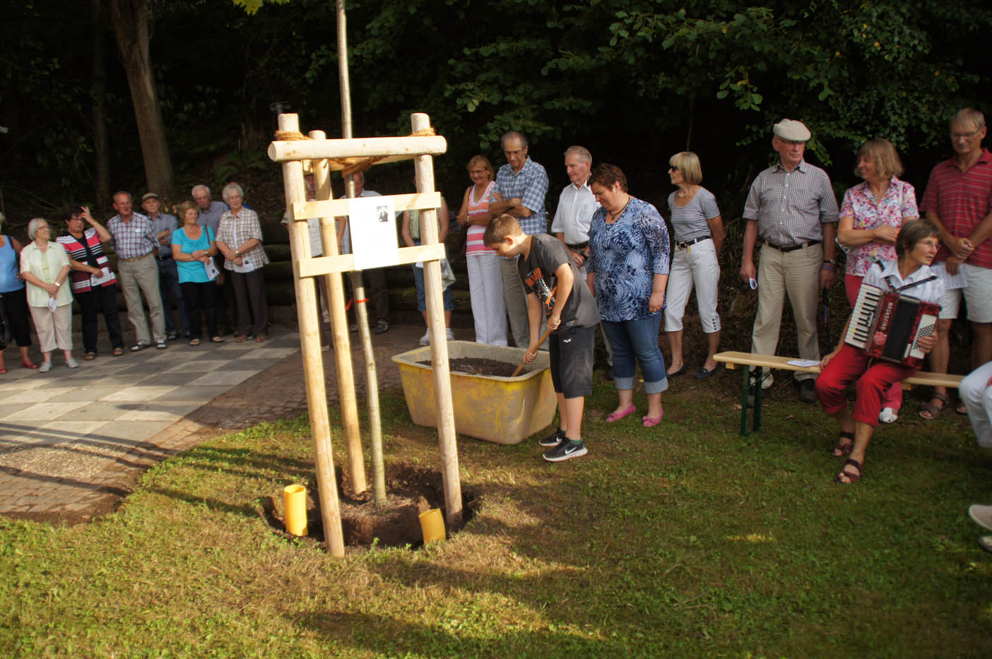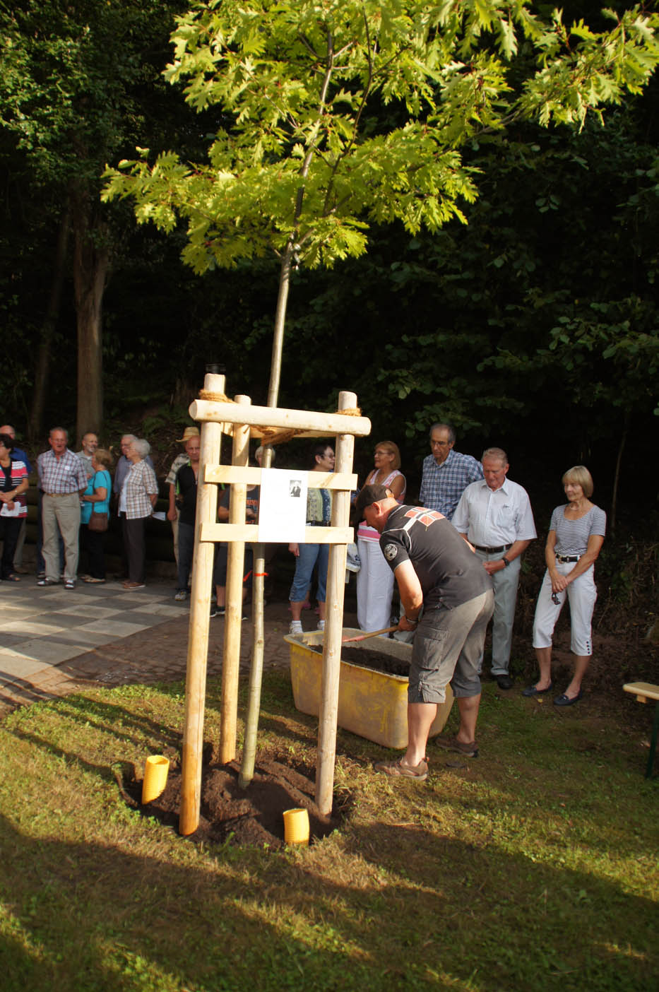 Im Anschluss an das Begehen des Jahneichen-Jubiläums zog die Versammlung in einem langen Tross zum Vereinsgelände des TV, wo auf der oberen Terrasse Karls Eiche auf ihre endgültige Pflanzung wartete.