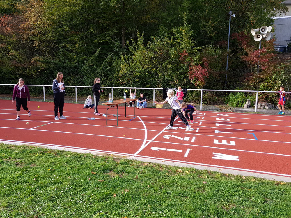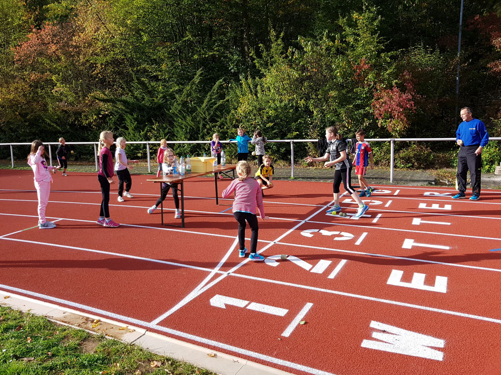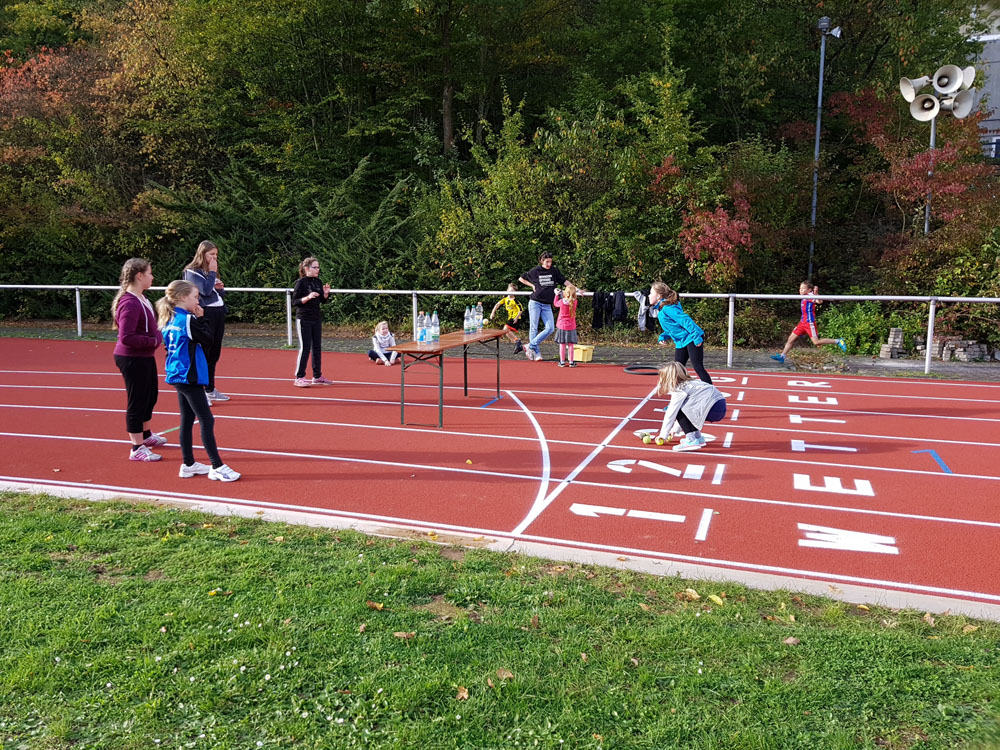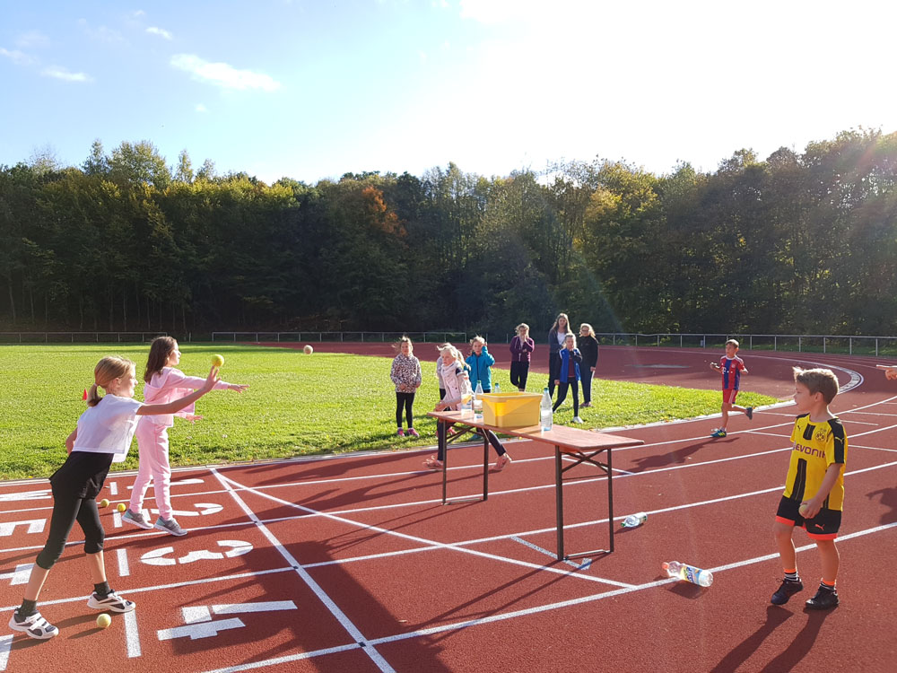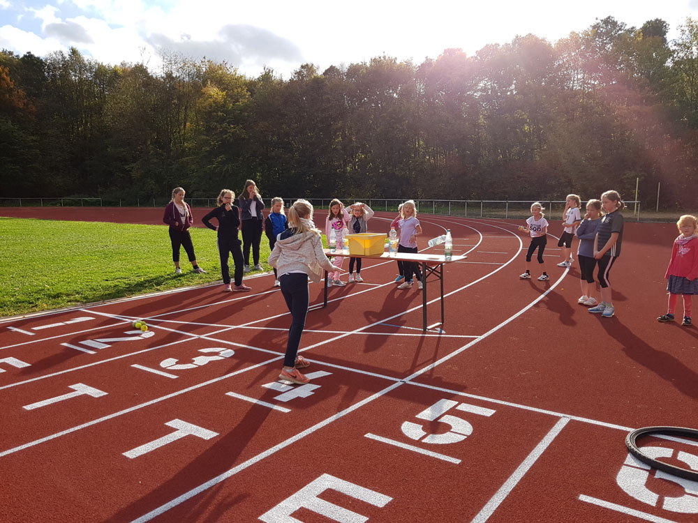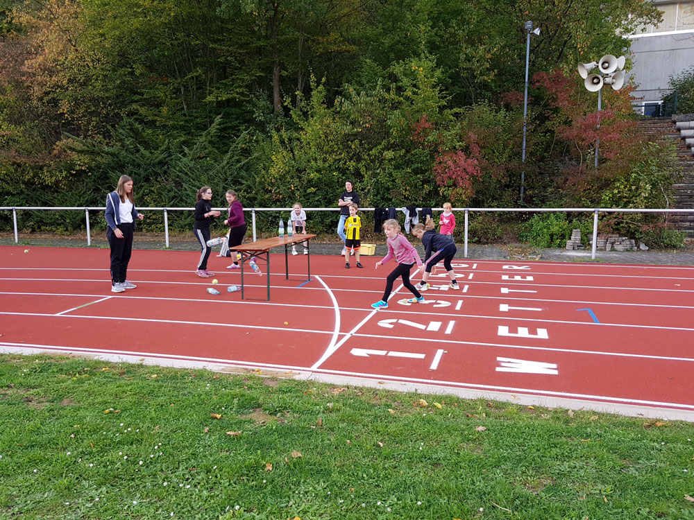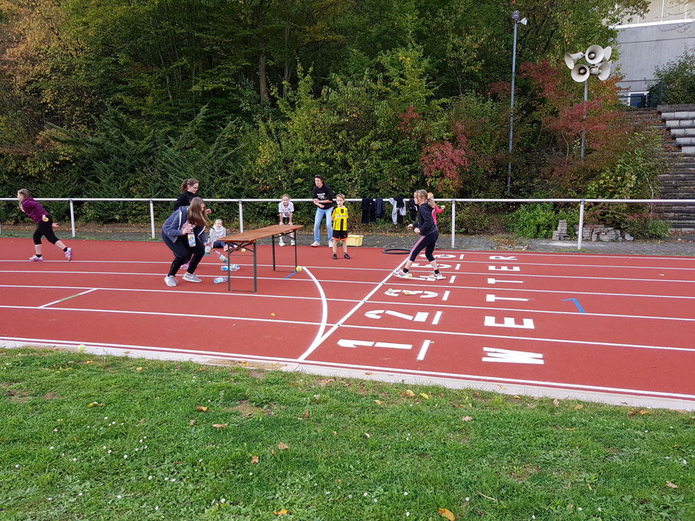 Mit 20 Jugendlichen aus der Jugendturn-Gruppe von Andrea Müller und aus der Jugend-Leichtathletik-Gruppe von Anna-Lena Wellner startete das vereinsinterne Lauffest mit einer Biathlon-Staffel. Hier mussten 4er-Teams eine Laufstrecke absolvieren und am Ende Flaschen von einem Tisch werfen. Für jede Flasche, die stehenblieb, musste man eine kleine Strafrunde laufen.