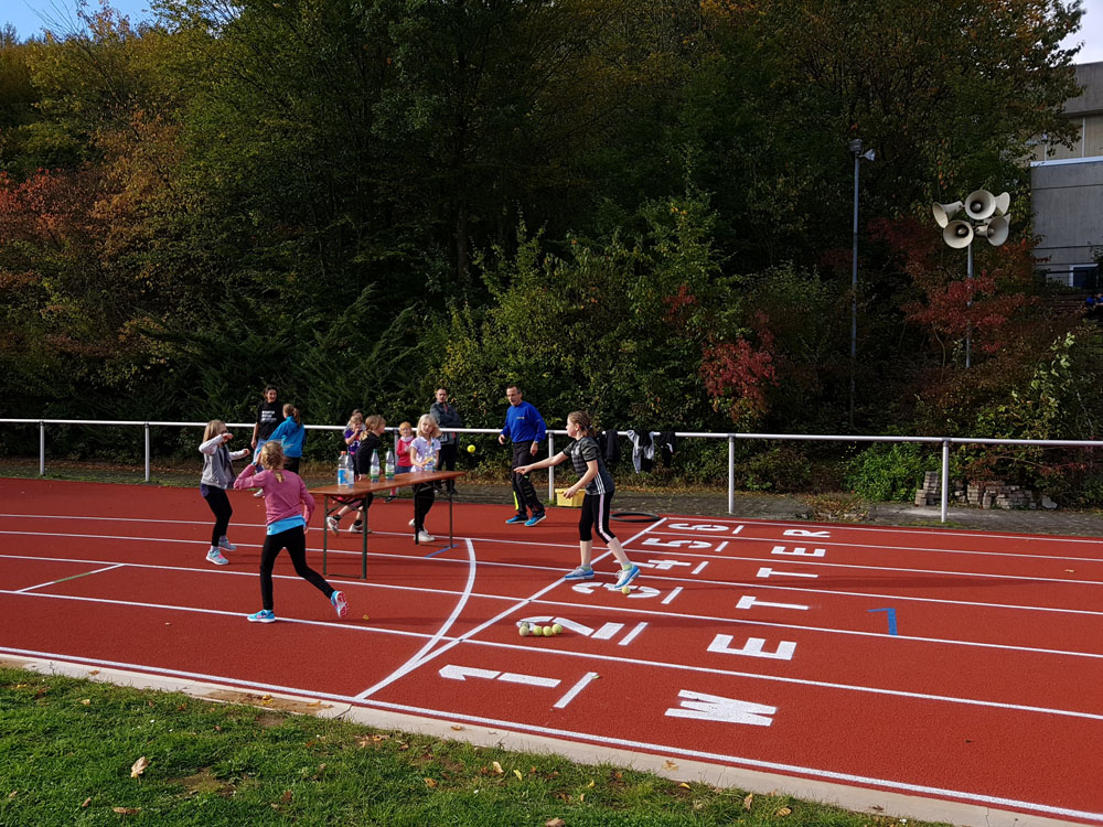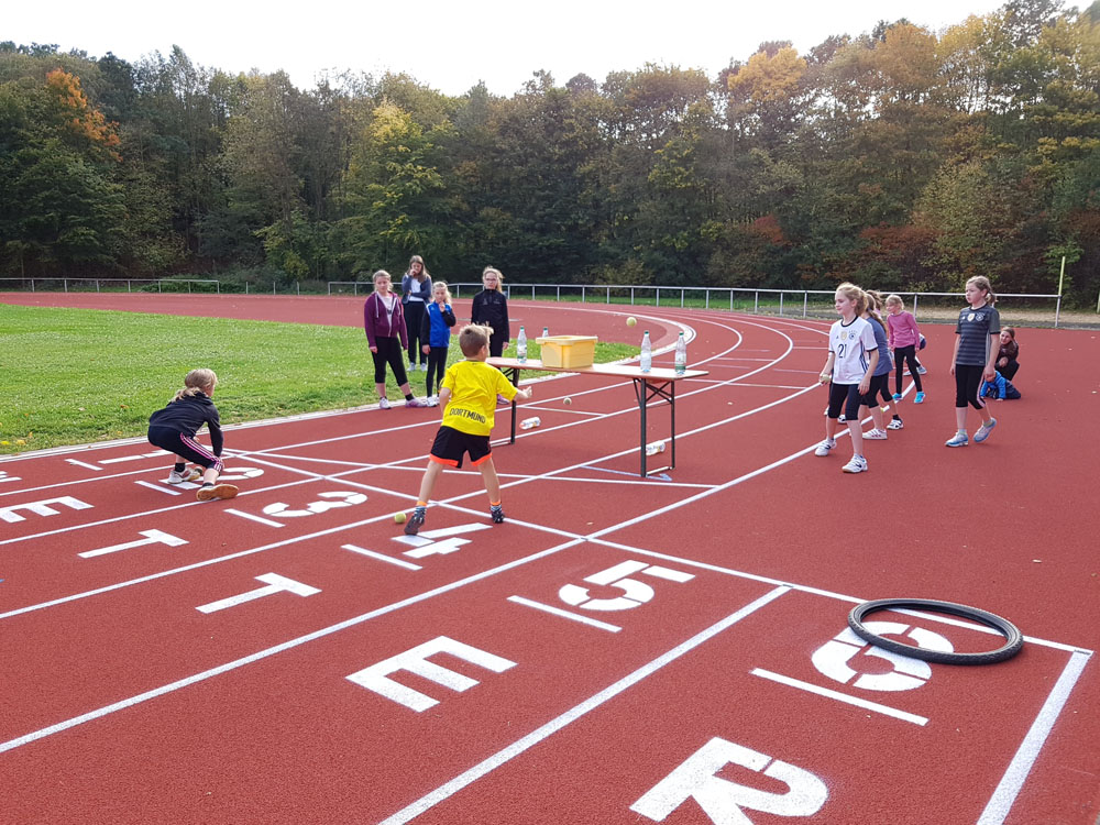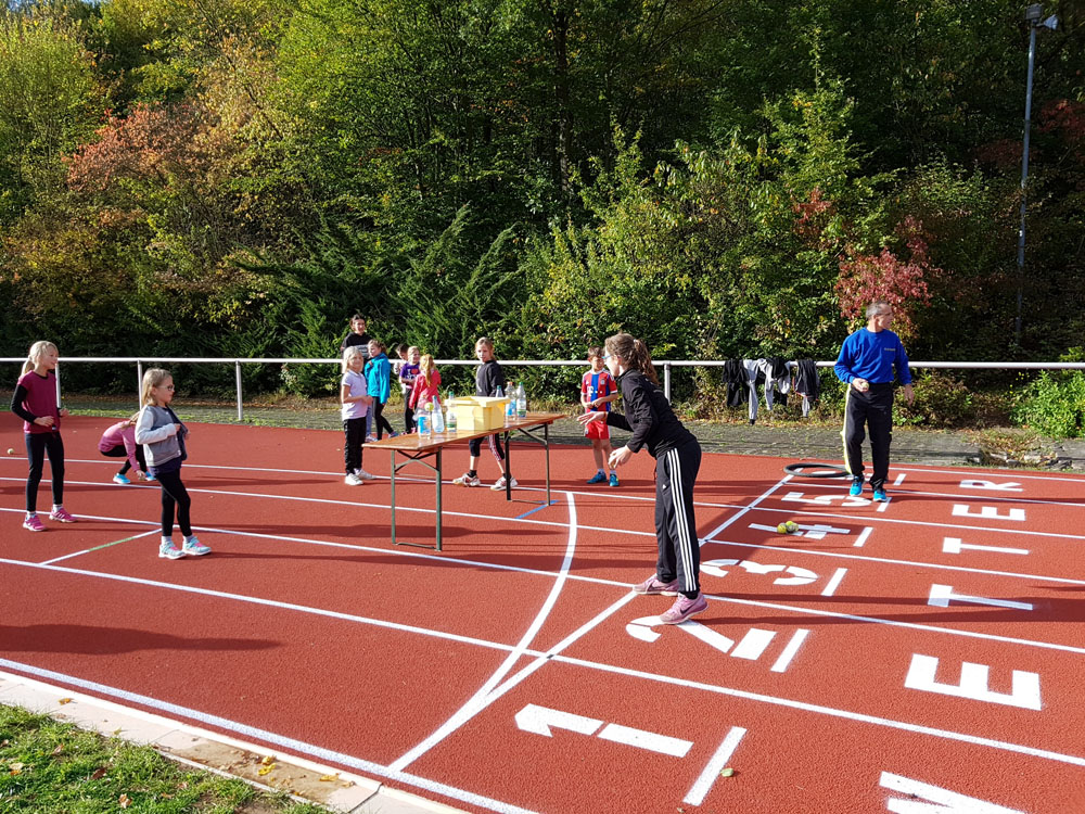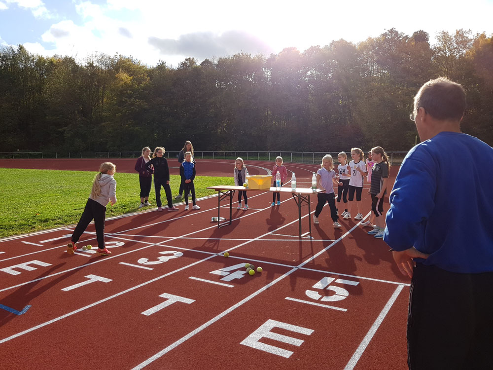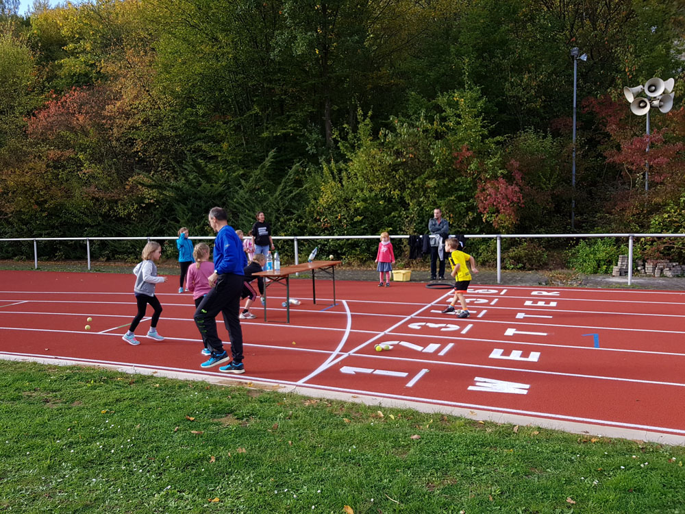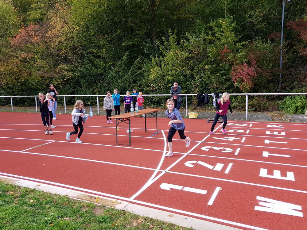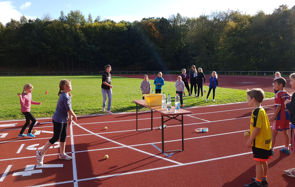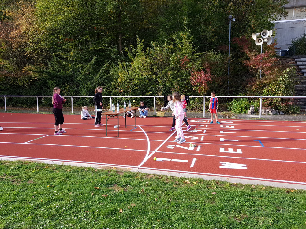 Mit 20 Jugendlichen aus der Jugendturn-Gruppe von Andrea Müller und aus der Jugend-Leichtathletik-Gruppe von Anna-Lena Wellner startete das vereinsinterne Lauffest mit einer Biathlon-Staffel. Hier mussten 4er-Teams eine Laufstrecke absolvieren und am Ende Flaschen von einem Tisch werfen. Für jede Flasche, die stehenblieb, musste man eine kleine Strafrunde laufen.